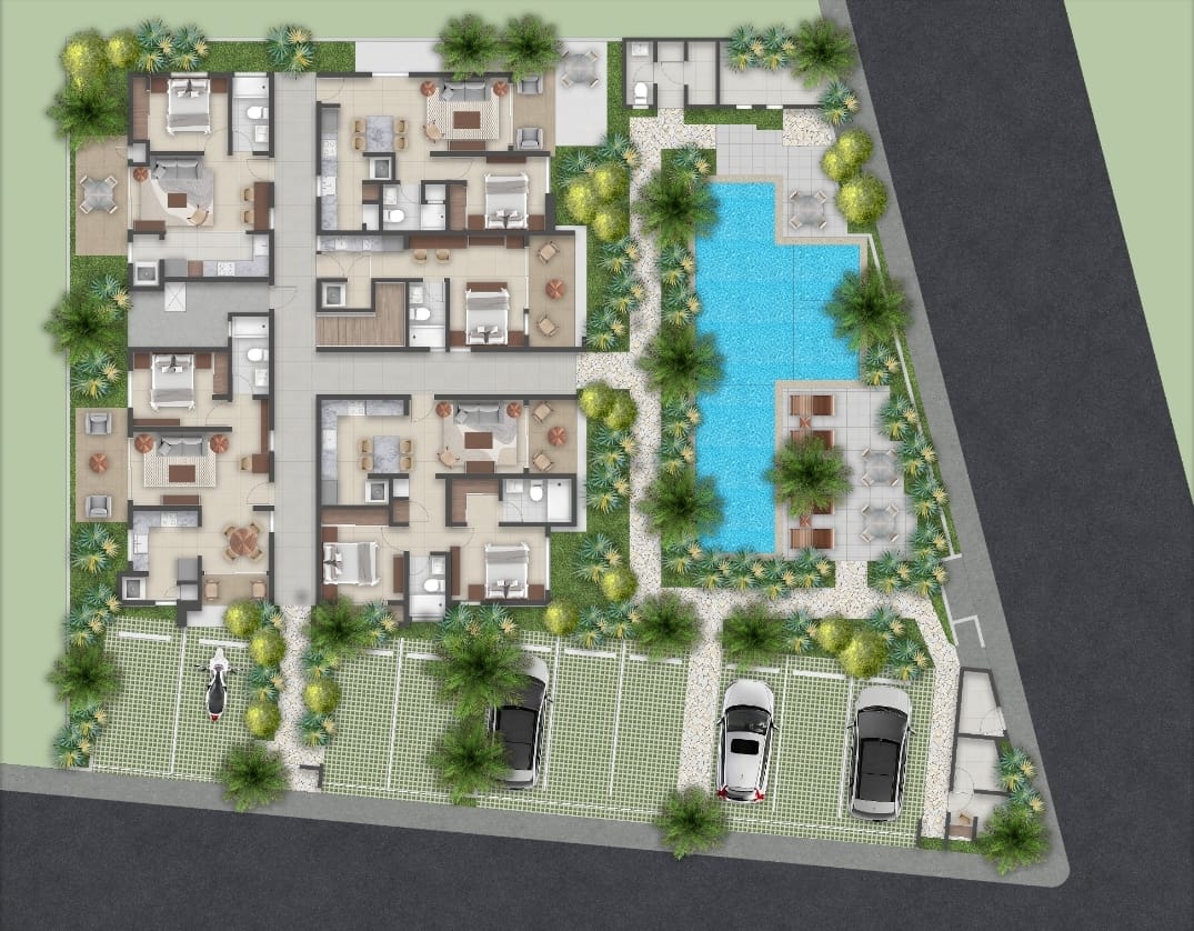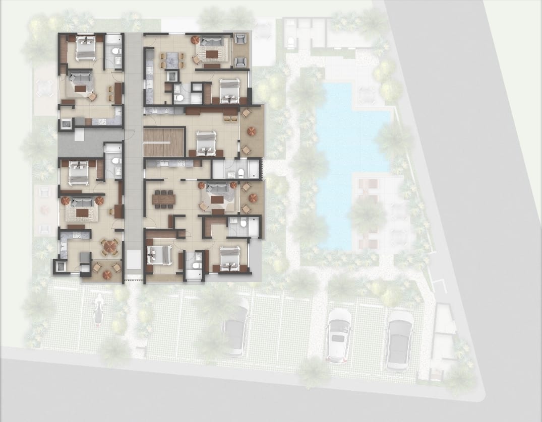Los Helechos Residence dispondra de unidades de 1 y 2 dormitorios con espacios adecuados tanto para uso de vivienda habitu7al o renta de larga temporada, ademas de aparta estudios optimizados para rentas.